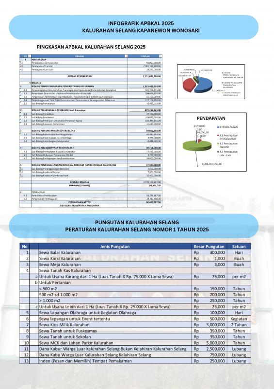 Pada Tahun 2025 ini Anggaran Pendapatan dan Belanja Kalurahan Selang Rp 2.199.503.407.00 ( Dua Milyar Seratus Sembilan puluh sembilan limaratus Tiga ,empat Ratus Tuju Ribu Rupiah ) untuk satu tahun kedepan .